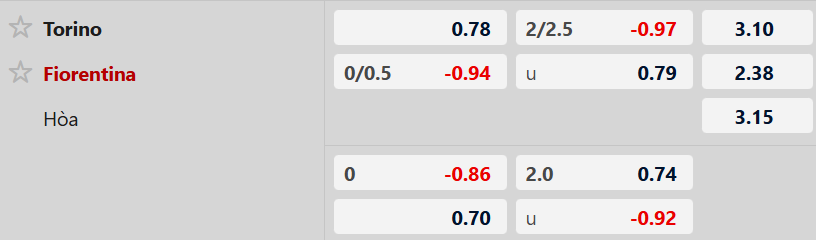 Torino đang có phong độ kém cỏi tại Serie A với 6 trận không thắng liên tiếp, vắt từ mùa giải trước qua hiện tại. Họ thậm chí để thua tới 5 trận trong số đó và thua kèo cả 6 trận. Ngược lại, Fiorentina còn thắng kèo được 3/6 trận gần đây tại Serie A. Chọn: Fiorentina cả trận