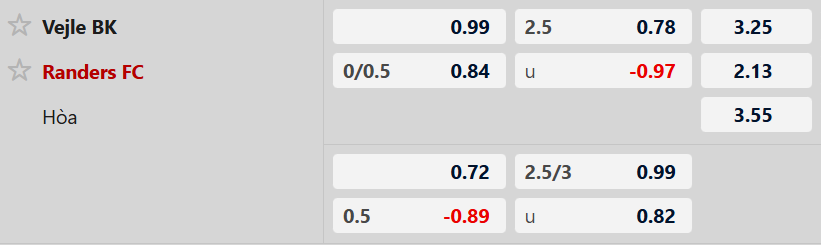 Vejle thậm chí thua kèo lẫn tỷ số toàn bộ 5 lần tiếp đón Randers thuộc giải VĐQG Đan Mạch kể từ tháng 10/2020. Hai trong số 5 thất bại ấy xảy ra khi Vejle được Randers chấp 0,25 trái. Vejle rõ ràng khó trở thành phương án mang tới nhiều niềm tin.