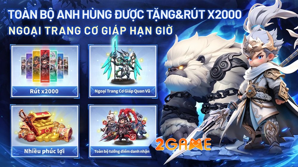 Theo như thông tin chia sẻ, ngay từ khi đăng nhập game, game thủ Tam Quốc Khởi Động sẽ nhận được 2000 lượt rút thẻ, đảm bảo mang về những vị tướng S+ cốt lõi, sẵn sàng dẫn dắt đội hình của bạn xưng bá thiên hạ. Chưa dừng lại ở đó, toàn bộ diện mạo anh hùng được mở khóa ngay lập tức, cho phép bạn tùy chỉnh đội hình với những chiến thần mang phong cách độc đáo, từ hình ảnh chibi dễ thương đến những bộ skin mecha giới hạn đầy chất tương lai. Chỉ cần đăng nhập, skin mecha độc quyền đã nằm trong tay bạn, biến các danh tướng như Lưu Bị, Tào Tháo hay Quan Vũ thành những cỗ máy chiến đấu siêu cấp, sẵn sàng đè bẹp mọi đối thủ.