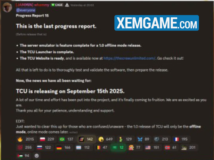 Trưởng nhóm dự án Whammy4 đã thông báo rằng The Crew Unlimited Launcher sẽ ra mắt vào ngày 15 tháng 9. Đây là dự án cung cấp máy chủ và người chơi cần sở hữu The Crew để có thể tiếp tục chinh chiến trong game, tuy vậy nhóm phát triển sẽ cung cấp quyền truy cập miễn phí cho mọi người. Phiên bản đầu tiên của TCU sẽ cho phép bạn chơi trò chơi đua xe ở chế độ ngoại tuyến, mặc dù chức năng trực tuyến dự kiến sẽ sớm ra mắt.