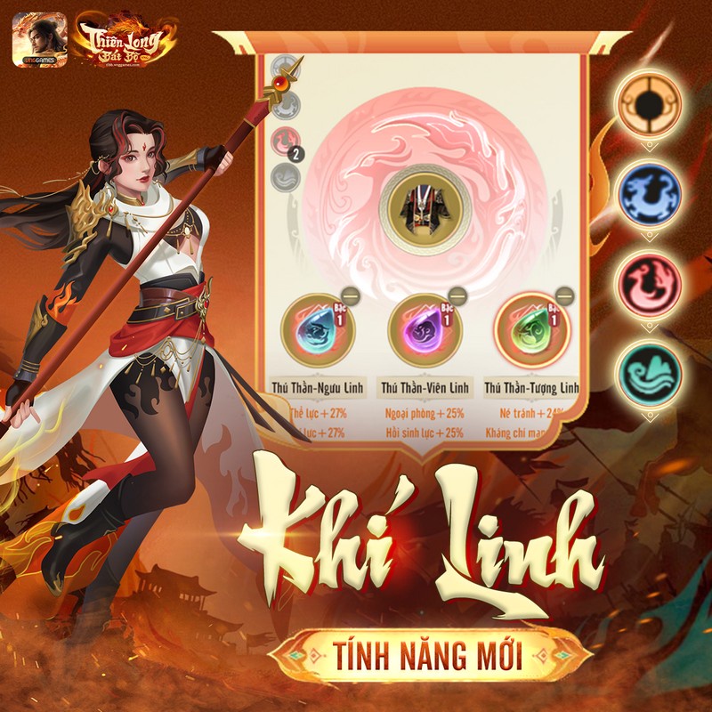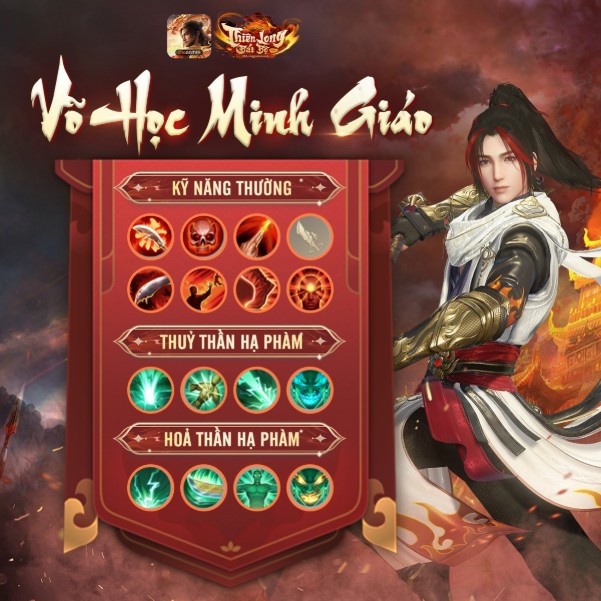 Với những chiêu thức đặc trưng như Thôi Tâm Chưởng, Hỏa Thiêu Xích Bích, Nộ Hỏa Liên Trảm hay Địa Ngục Hỏa, Minh Giáo không chỉ gây lượng sát thương cực cao mà còn đi kèm loạt hiệu ứng khống chế khó chịu như Choáng, Định thân, Giảm tốc… Việc kết hợp cùng các Hào Kiệt quen thuộc như Kiều Phong, A Châu, Vương Ngữ Yên… còn mở ra nhiều chiến thuật đa dạng trong giao tranh tổ đội và liên server. Minh Giáo đặc biệt nổi bật với hai trạng thái chiến đấu độc đáo: Thủy Thần Hạ Phàm và Hỏa Thần Hạ Phàm. Ở Thủy Thần Hạ Phàm, nhân vật được miễn khống chế, miễn tử vong, đồng thời liên tục tung ra các chiêu thức diện rộng gây sát thương cao lên nhiều mục tiêu. Trong Hỏa Thần Hạ Phàm, Minh Giáo là môn phái duy nhất có khả năng vô hiệu phòng ngự và kháng thuộc tính, giúp tạo đột phá cực mạnh trong các pha dồn sát thương đơn lẻ. Khi kết hợp cùng kỹ năng Quyết Đấu và Nộ Hỏa Liên Trảm, Minh Giáo có thể kết liễu mục tiêu chỉ trong chớp mắt. Khí Linh – Tăng sức mạnh binh giáp, triệu hồi hồn thú Một trong những tính năng đột phá của phiên bản này chính là Khí Linh – cơ chế tăng cường trang bị thông qua việc khảm hồn thú vào giáp trụ. Với 6 loại Khí Linh đại diện cho sức mạnh dã thú (Hổ, Lang, Gấu, Ngưu, Viên, Tượng), người chơi có thể tăng đáng kể chỉ số trang bị, kích hoạt kỹ năng bộ và nâng cao năng lực chiến đấu.