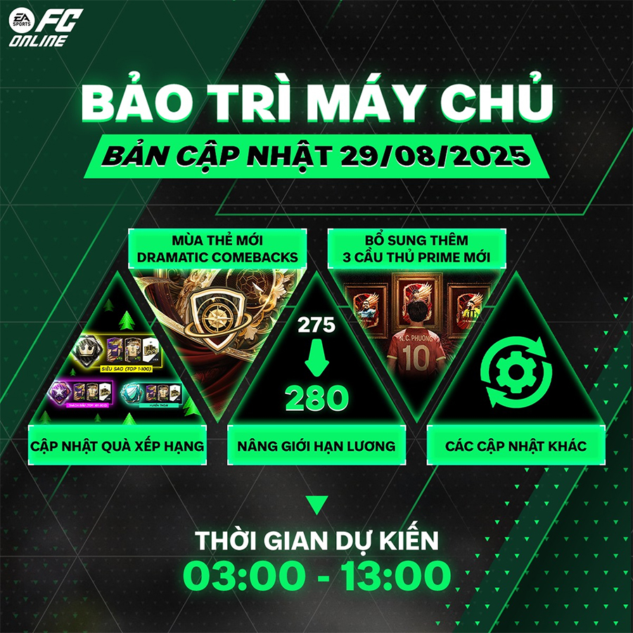 Sáng ngày 29/8, máy chủ FC Online sẽ bảo trì cập nhật phiên bản mới. Sau đây là những mốc thời gian mà các HLV cần chú ý: