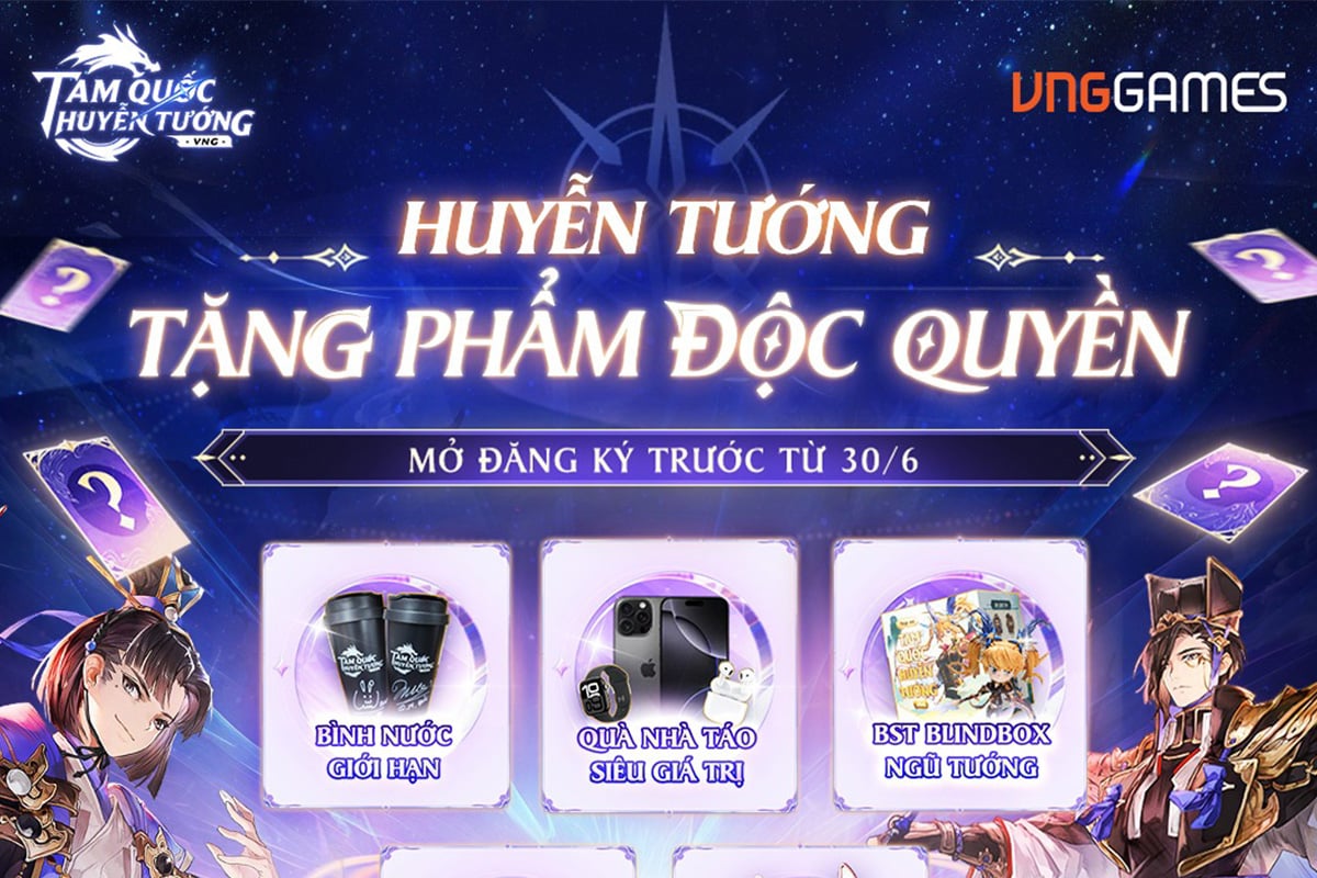 Tham gia đăng ký trước, người chơi có cơ hội nhận được một trong các phần thưởng sau: iPhone 16 Pro Max, Apple Watch Series 10, AirPods 4, bình nước phiên bản giới hạn có chữ ký đại diện game, gấu bông Tiểu Thố, lót chuột mỹ nhân và rất nhiều giftcode giá trị lớn dùng khi game ra mắt chính thức. Đặc biệt, người chơi sẽ có cơ hội “khui túi mù” với bộ sưu tập blindbox Ngũ Tướng độc quyền từ Tam Quốc Huyễn Tướng VNG.