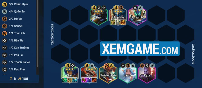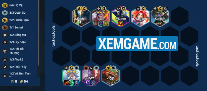 Về cách xây dựng, chúng ta sẽ ưu tiên slow roll Janna và Rakan 3 sao ở cấp độ 6. Ưu tiên khi khởi đầu có Janna sớm cùng những vị tướng Hộ Vệ 2 sao. Đội hình đầy đủ bao gồm: Malphite, Kennen, Rakan, Janna, Neeko, Ziggs, Ryze và K’Sante.