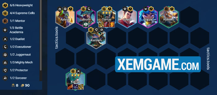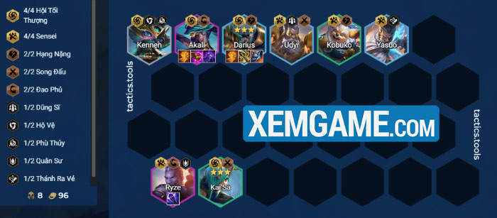 Là một carry 3 vàng, chúng ta sẽ ưu tiên lối chơi fast 7 để roll Darius 3 sao. Có nhiều khung bài khác nhau nhưng nòng cốt sẽ là Hội Tối Thượng kết hợp cùng các quân cờ trong tộc hệ khác là Sensei hoặc Hạng Nặng. Sensei sẽ là khung bài mạnh nhất, đặc biệt là khi có nâng cấp Hội Đồng Sư Phạm, có thể slow roll các vị tướng như Kobuko, Yasuo hoặc cả Udyr 3 sao. Đội hình đầy đủ bao gồm: Kennen, Kobuko, Kai’Sa, Udyr, Yasuo, Darius, Akali và Ryze.
