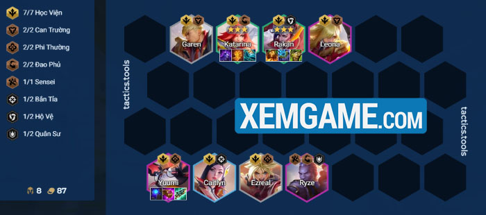 Với đội hình sử dụng carry 2 vàng, chúng ta vẫn cứ lên thẳng 6 và slow roll mà thôi. Lên Kata 3 sao, nếu được thì là cả Rakan 3 sao rồi sau đó khung bài ở 8 với 7 Học Viện là hoàn thành. Đội hình đầy đủ bao gồm: Garen, Ezreal, Kata, Rakan, Caitlyn, Yuumi, Ryze và Leona.